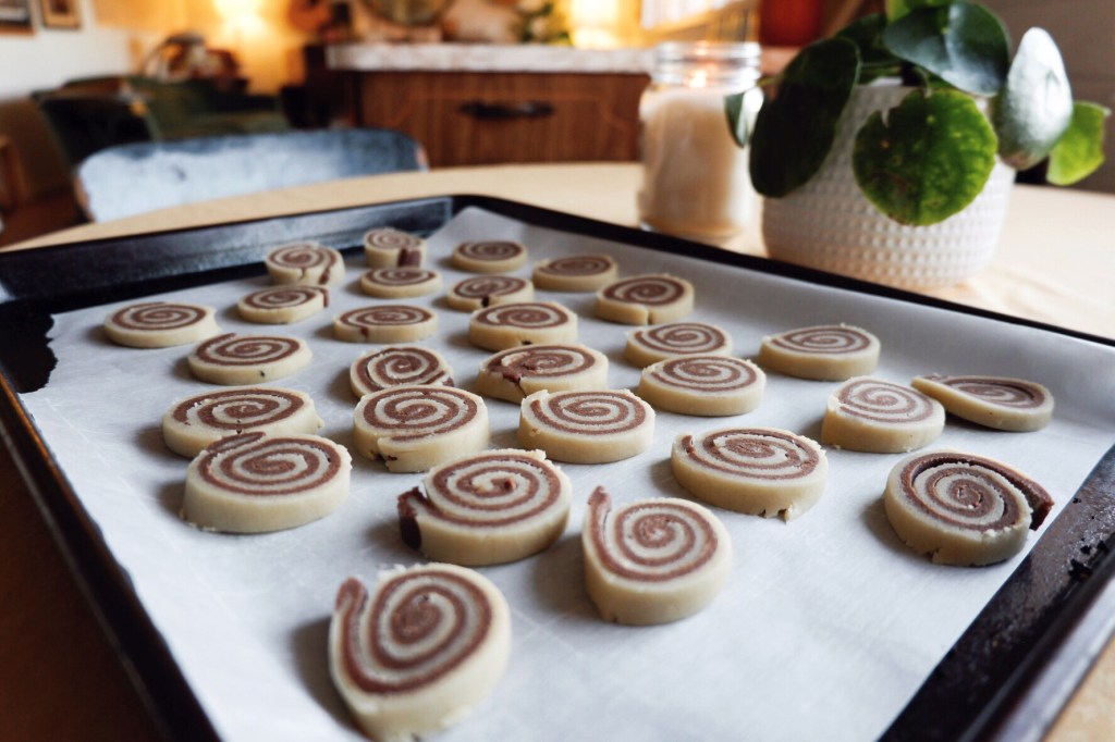 6. Slice dough into 1/4 inch thick rounds, rotating dough so it will not become too misshapen from the weight of the knife. Place cookies 1 inch apart on a prepared cookie sheet (with parchment) and bake until golden brown, about 15 minutes at 350 degrees. Transfer to wire rack, let cool to room temp, and don’t eat them all in one sitting!