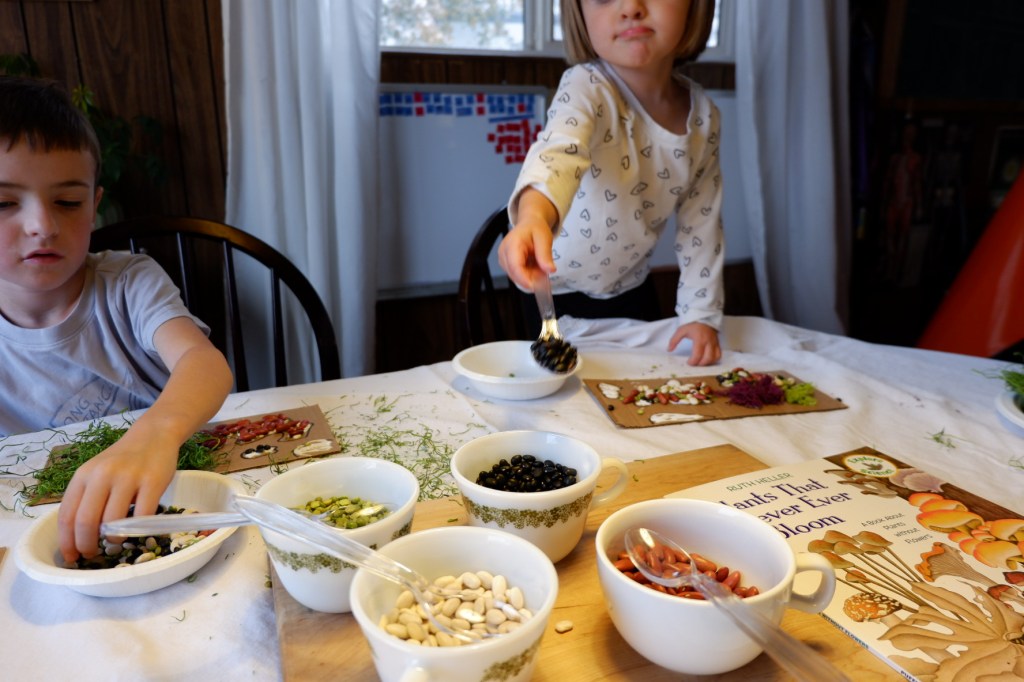 Babies are the wild cards! Sometimes they’re on your hip, playing with the older ones, eating in the high chair, playing with dried pasta on the table top, and sometimes you’re hunched over nursing them while reading from the natural history book. I have no easy solution for the babies. Mine is often with me, playing at my feet, nursing, but also I have had great success with allowing my kinder age son to play with her and “be in charge” so I can have some time without her for a while.